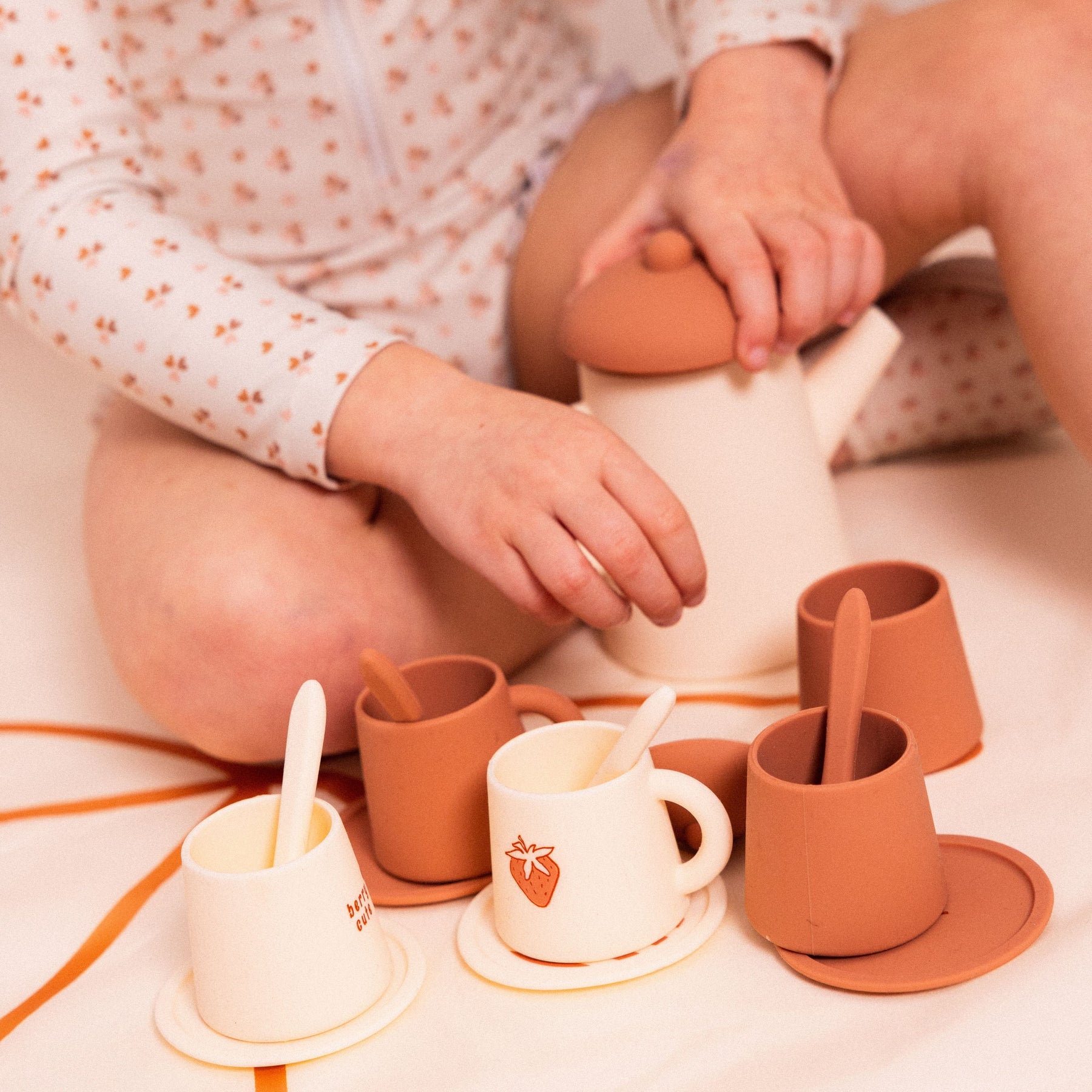 Sweeten your little ones pretend play sessions with this sweet Strawberry Fields 9pcs, Silicone Tea Set.