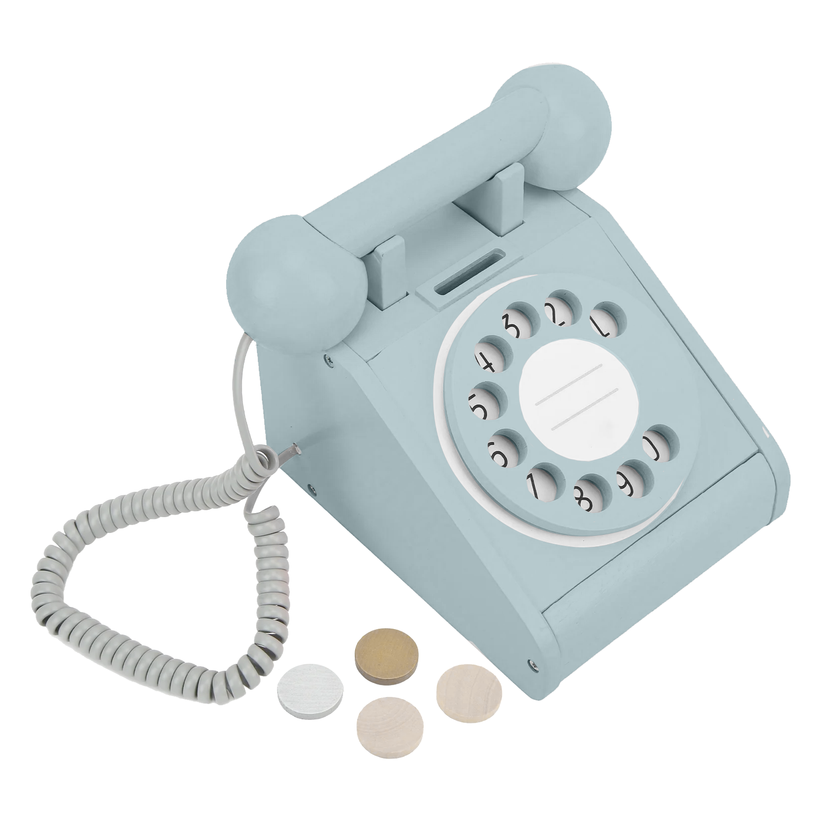 This retro-inspired wooden phone brings imaginative play to completely new level. Your little ones can turn the rotary dial, insert one of the 4 wooden coins (and watch them pop out when the handset is replaced), and safely store their treasures in the built-in coin drawer.