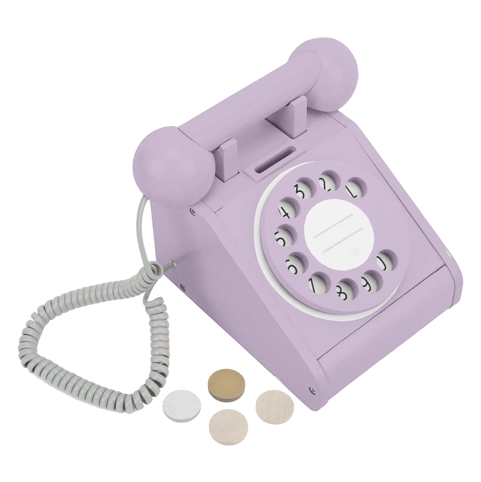 This retro-inspired wooden phone brings imaginative play to completely new level. Your little ones can turn the rotary dial, insert one of the 4 wooden coins (and watch them pop out when the handset is replaced), and safely store their treasures in the built-in coin drawer.